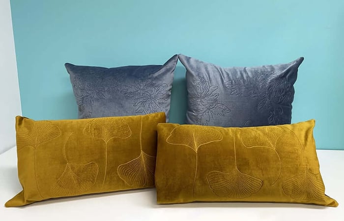 We used three beautiful chrysanthemum designs on a deep blue velvet, stitched with Backstitch and digitized using the Redwork tool. On the mustard velvet, we used Contour stitch to create a stylized ginkgo leaf pattern and Stemstitch for the stems. The result? Two sets of cushions with a subtle, tone-on-tone look that reads as both sophisticated and timeless.