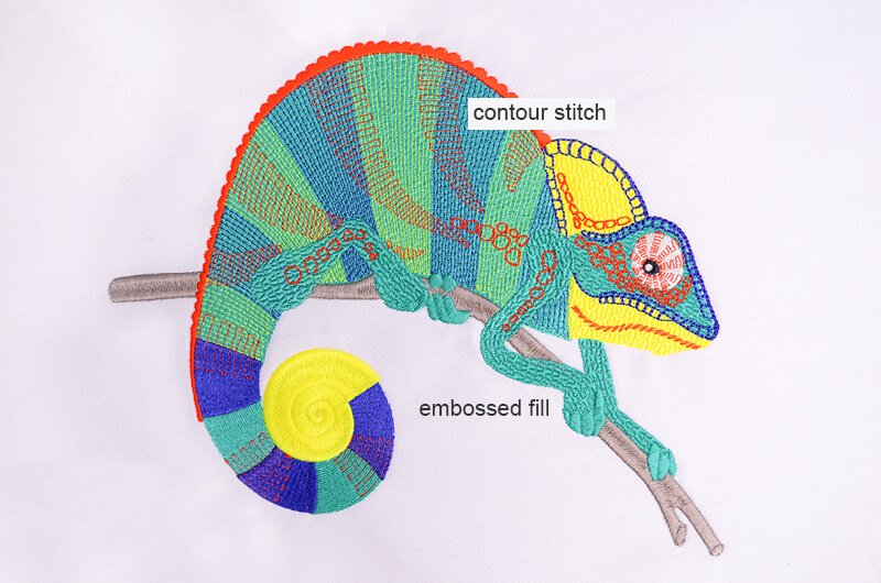 Contour stitch is a decorative stitch type that follows the contours of a shape, creating a flowing, natural look. This stitch is ideal for designs that require a sense of movement or organic lines, such as floral patterns, animal figures, and freeform shapes.