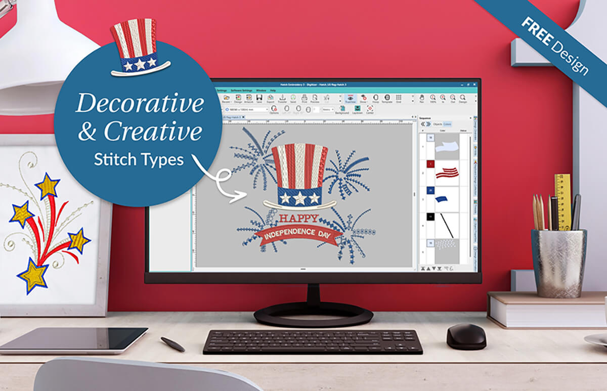 You can download the 4th of July Hat free designs by clicking the button below. This design was created using a variety of Motif run stitches and Embossed fills in Hatch Embroidery. It is perfect to celebrate Independence Day.