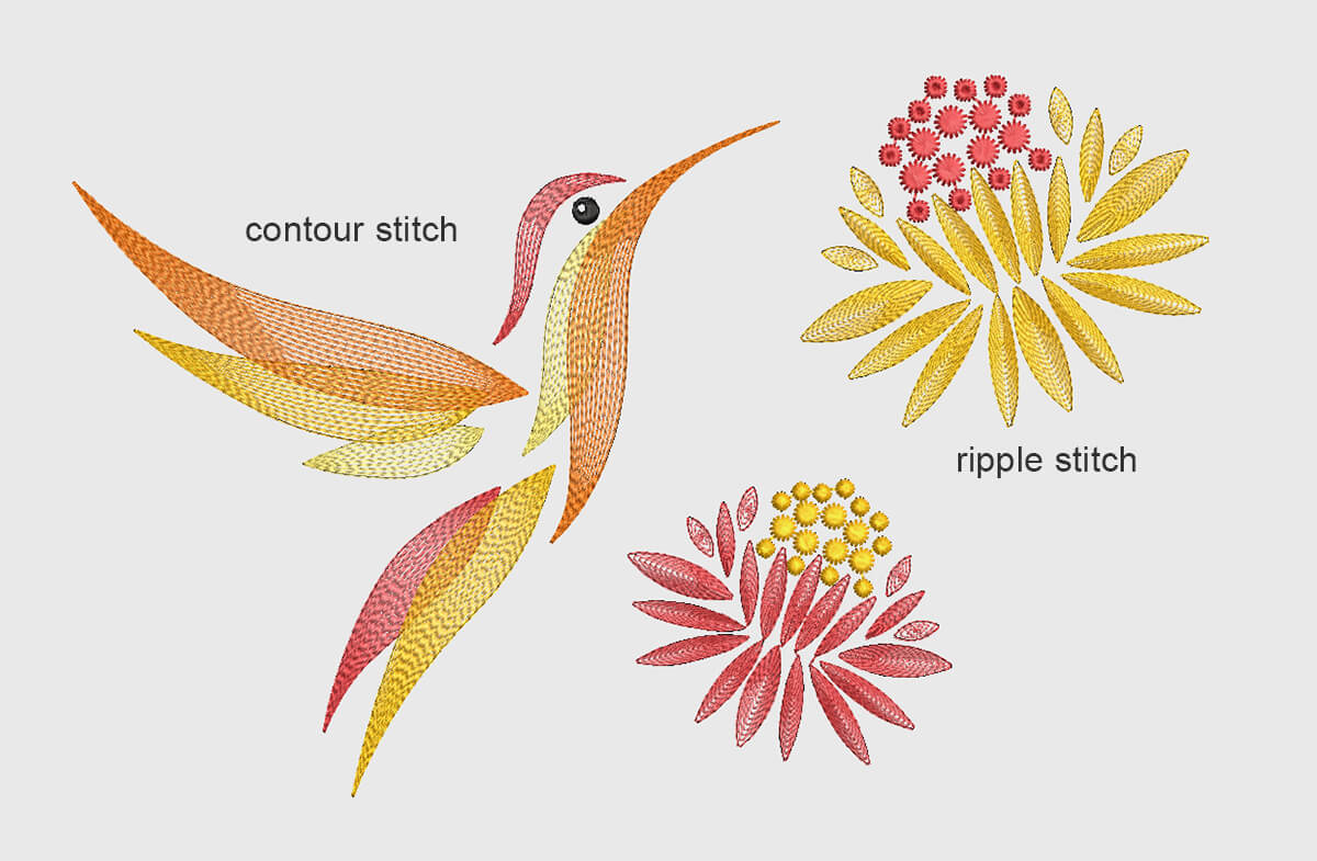 Ripple stitch is another fascinating decorative stitch type available in Hatch Embroidery software. This stitch creates a light effect that can add a dynamic and playful element to your designs. Ripple stitches are perfect for floral or animal themed designs, especially for birds, abstract art, or any project that could benefit from a sense of movement and rhythm.